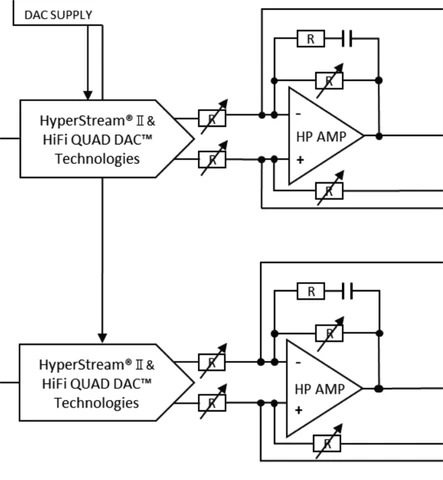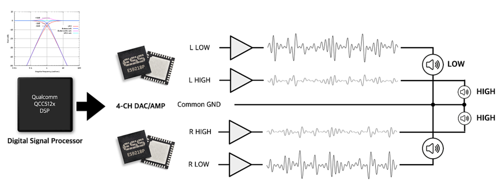 - DAC/AMP段から左と右だけでなく、更に低音用と高音用を分けて処理を行い出力